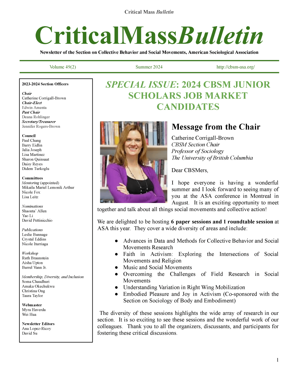 The Summer 2024 edition of Critical Mass Bulletin is now available. This special issue covers the section’s junior scholars job market candidates. Get your PDF copy here:
